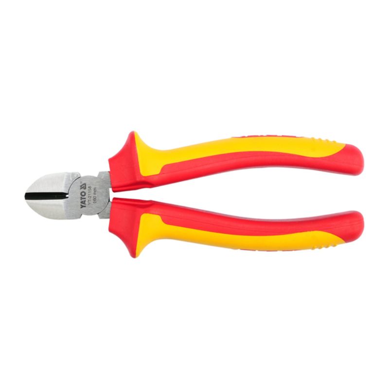 Alicate de corte diagonal YT-21158 con aislamiento VDE, fabricado en acero CrV de alta calidad. Hoja con ranuras antideslizantes en toda la longitud del elemento cortante.