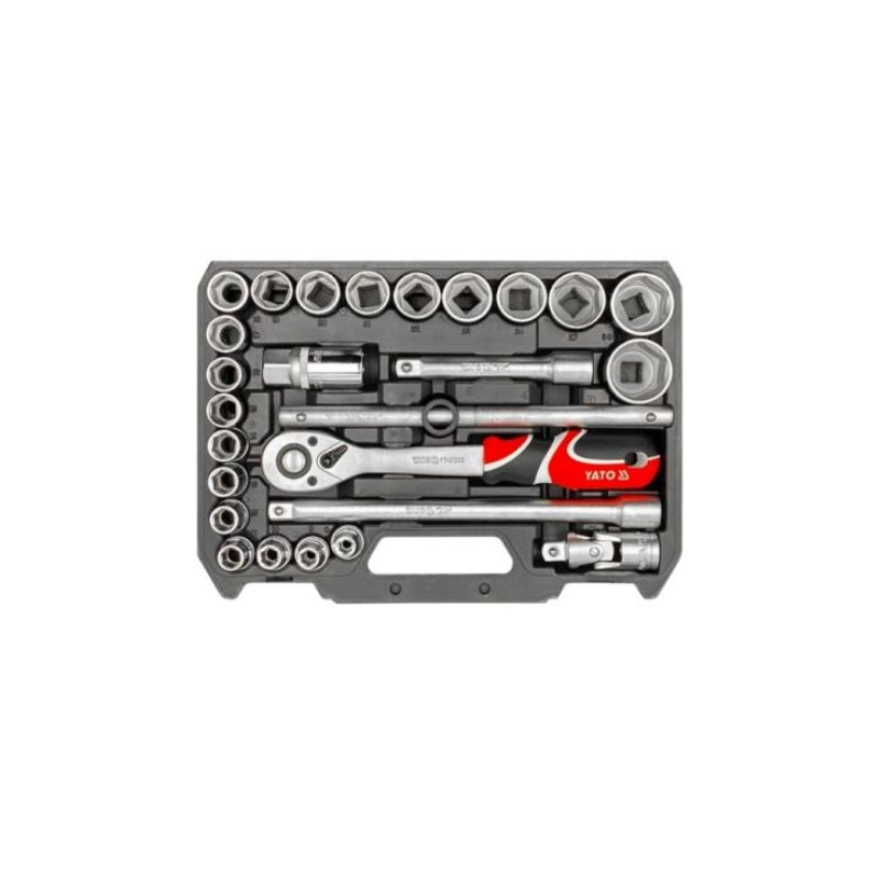- El juego incluye: Un juego completo con un total de 26 piezas.<br>Dado hexagonal de 6 puntas (1/2″): 8 mm, 9 mm, 10 mm, 11 mm, 12 mm, 13 mm, 14 mm, 15 mm, 16 mm, 17 mm, 18 mm, 19 mm, 20 mm, 21 mm, 22 mm, 23 mm, 24 mm, 27 mm, 30 mm, 32 mm.</br><br>Extensión (1/2″): 127 mm y 250 mm.</br><br>Dado para bujías (1/2″): 21 mm.</br><br>Barra deslizante en T (1/2″): 255 mm.</br><br>Mango de trinquete (1/2″): 255 mm.<br>Junta universal (1/2″).</br><br>